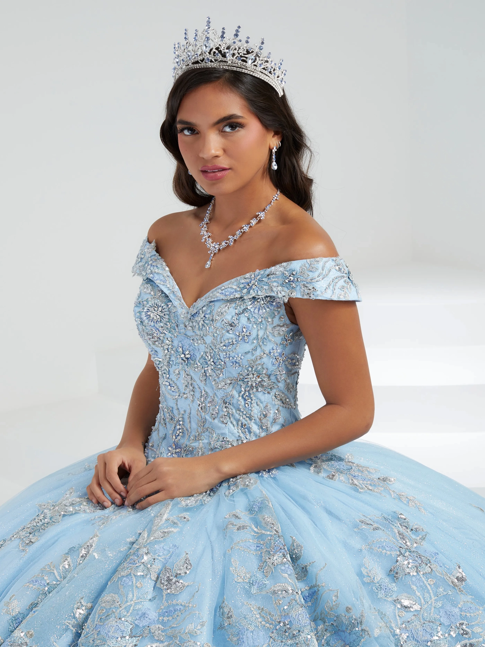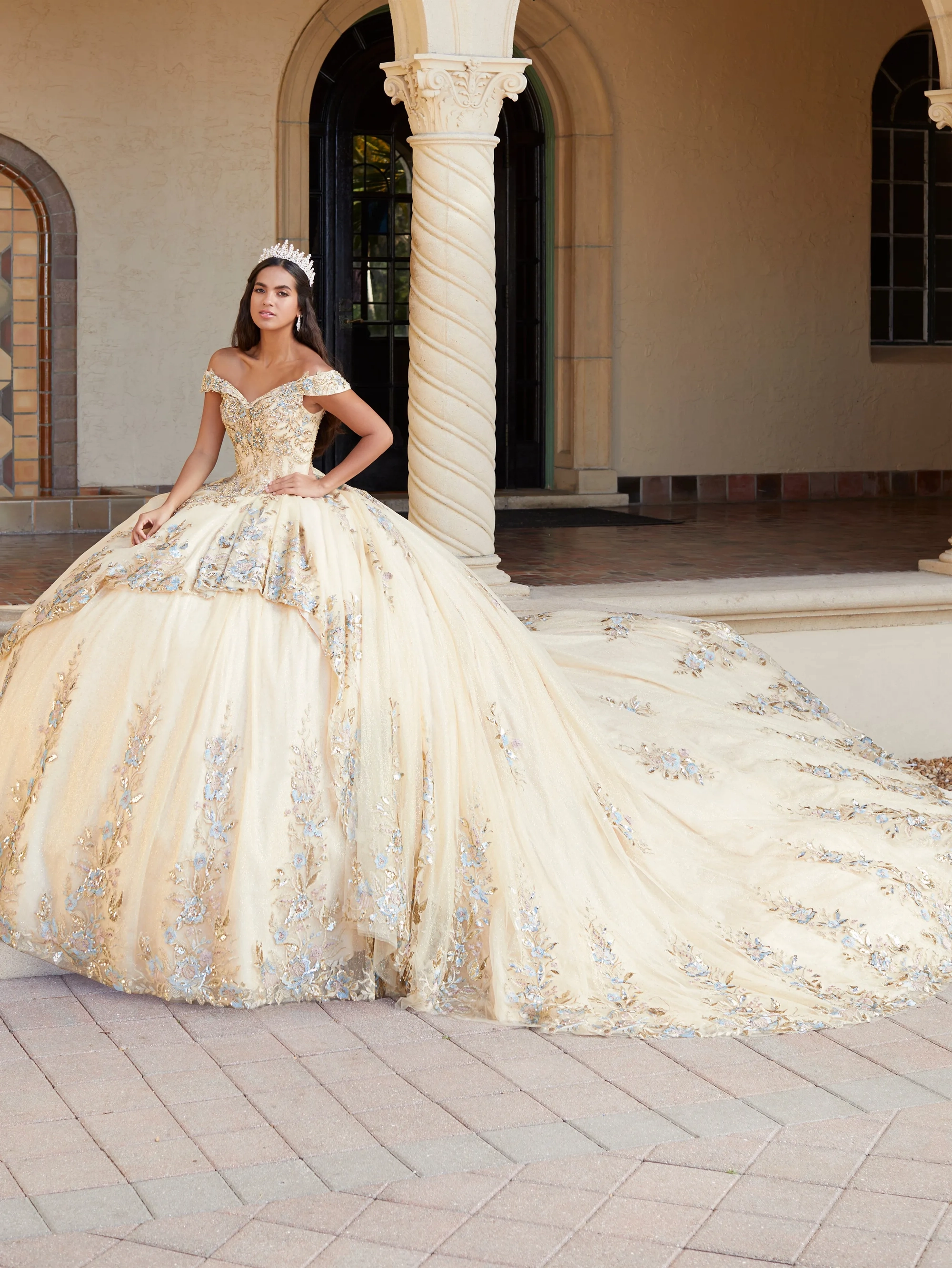 Shimmering quinceanera ball gown glows with crystal beading, large floral metallic lace appliques, a stunning sweetheart bodice, and an off-the-shoulder portrait neckline. Featuring a two-piece high-low detachable ball gown skirt. Lace-up back and royal train complete the look.