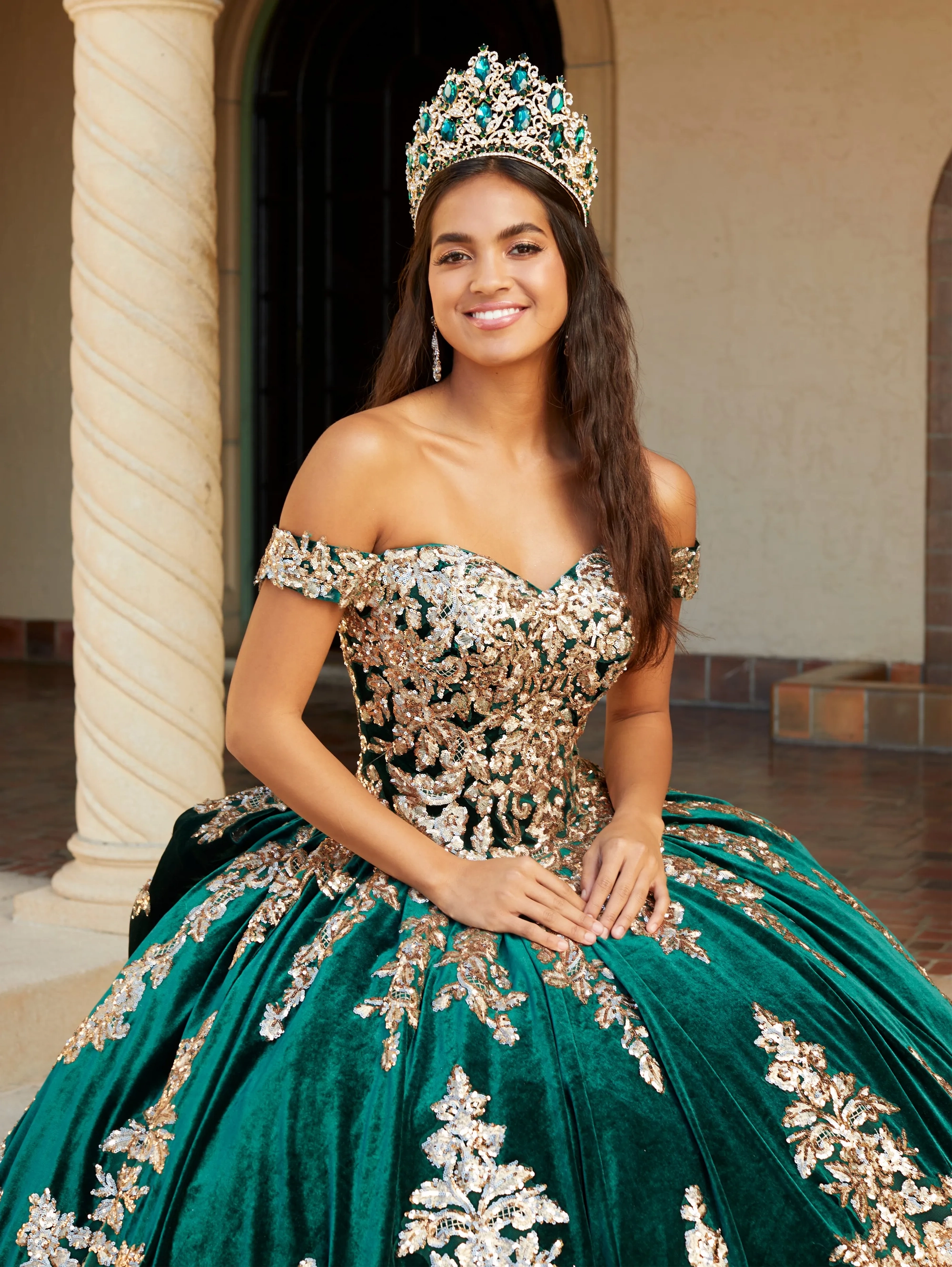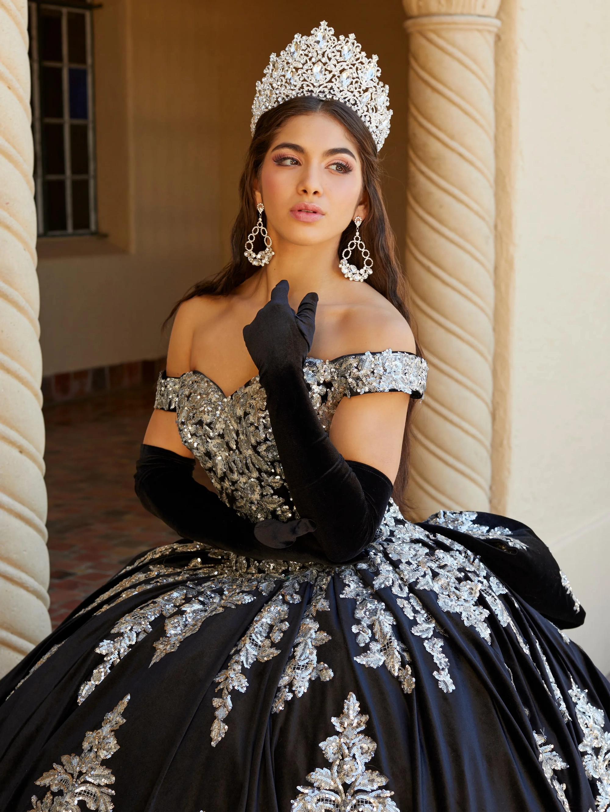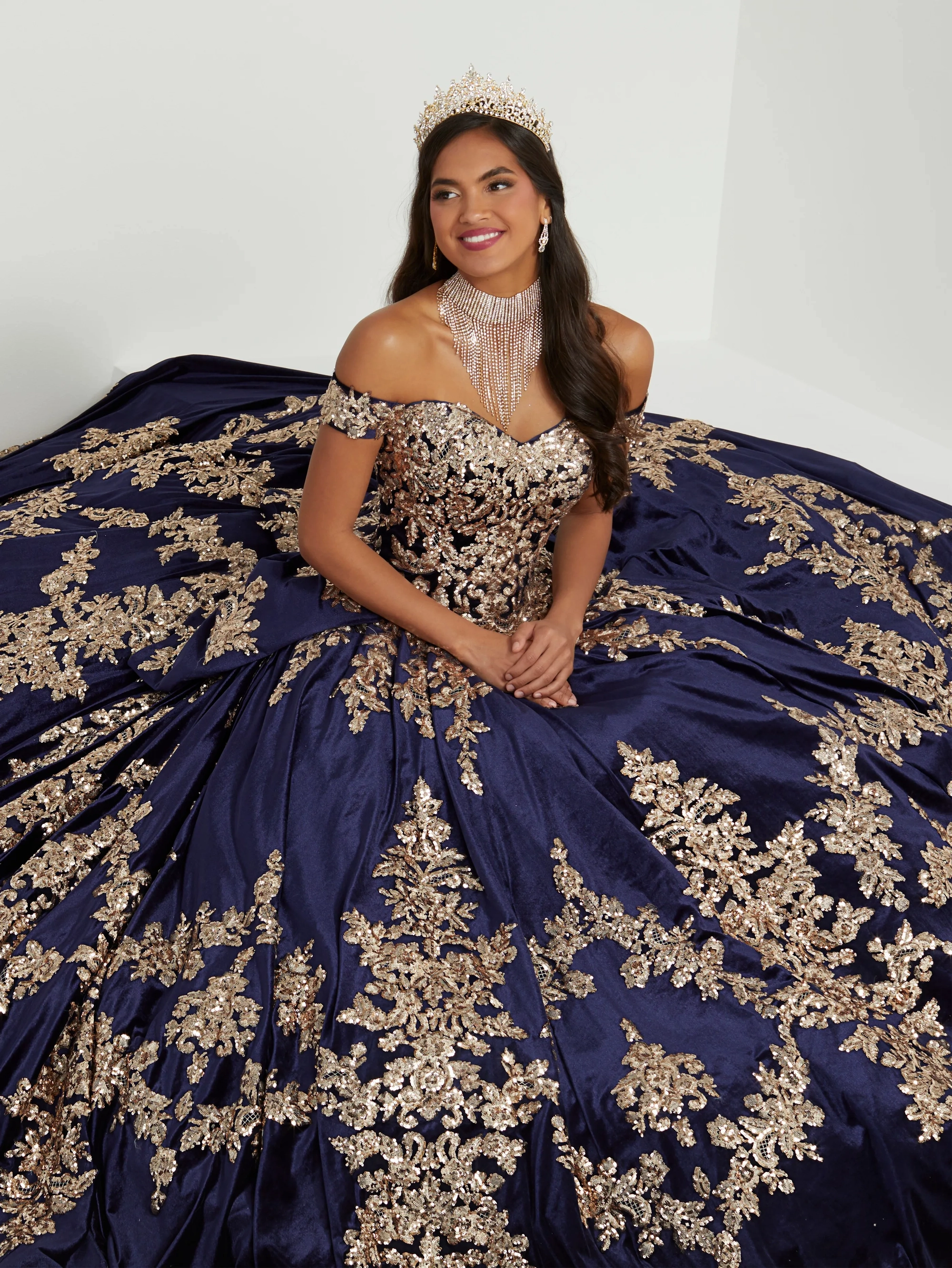 Reigning in royalty this quinceanera dress features off-the-shoulder straps and sweetheart neckline. The bodice is adorned with beaded sequin and embroidered lace appliques that trails past natural waist and features and exquisite ball gown skirt featuring the metallic lace design on and around the skirt. Lace-up back, royal train, detachable bow and matching gloves complete the look.