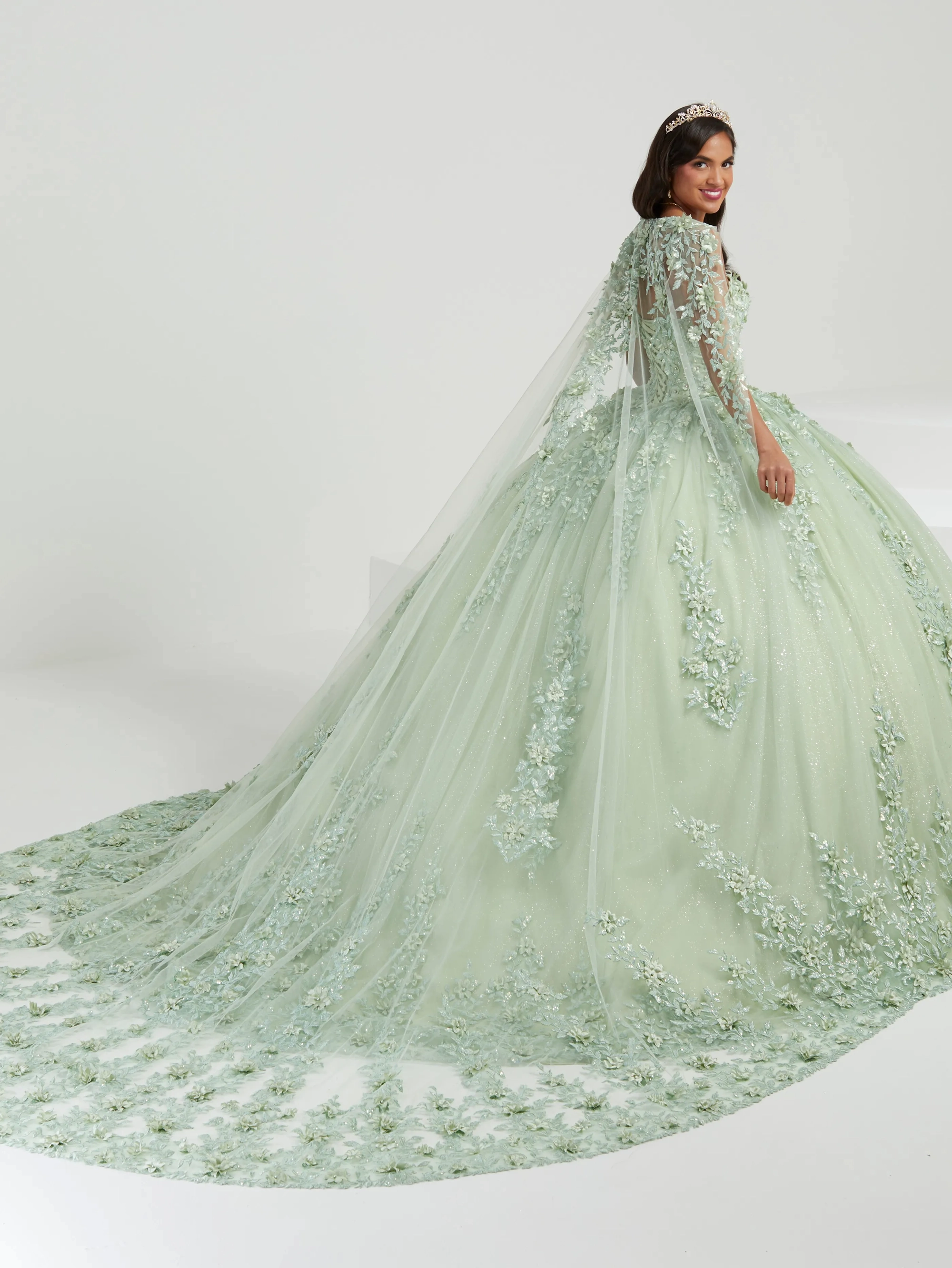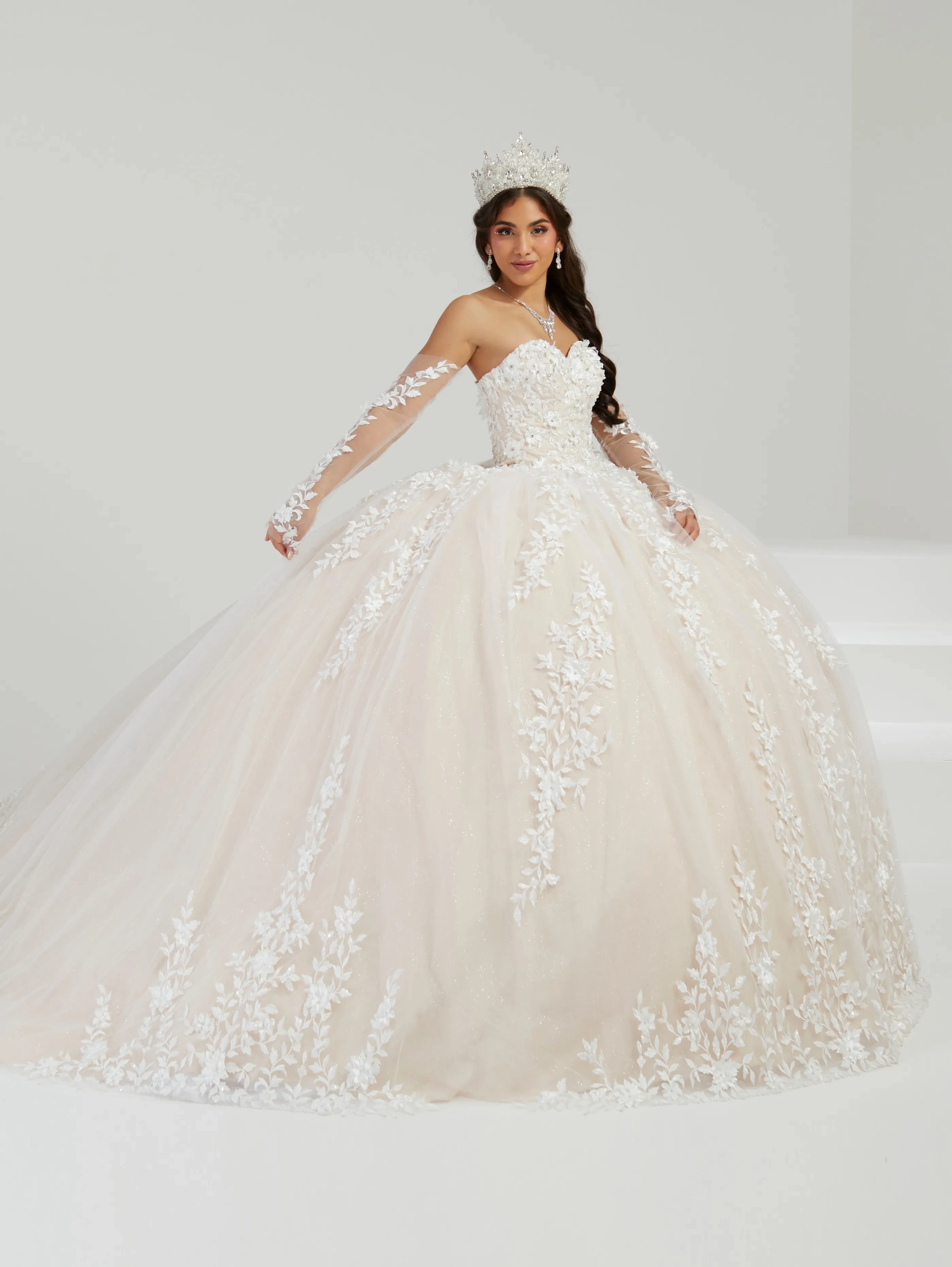 Romantic quinceanera dress features a strapless sweetheart neckline. The bodice is adorned with three-dimensional lace appliques that trails past the natural waist and cascades down the sparkle tulle ball gown skirt. Lace-up back, matching lace gloves and cape complete the look.